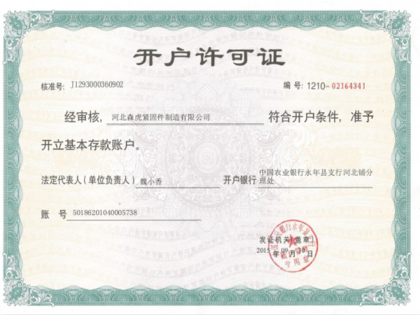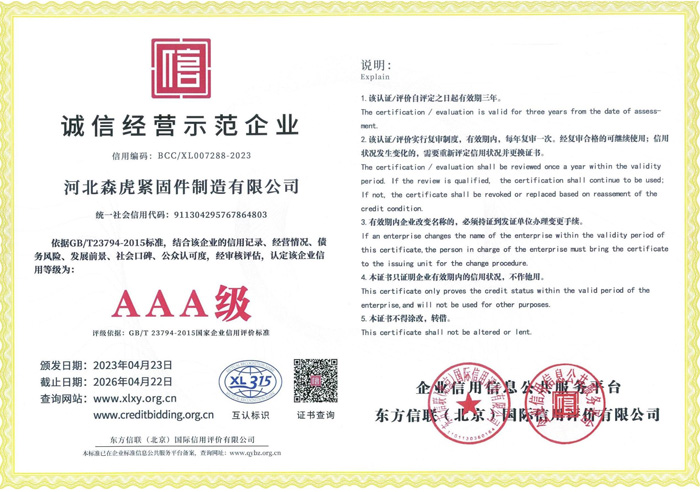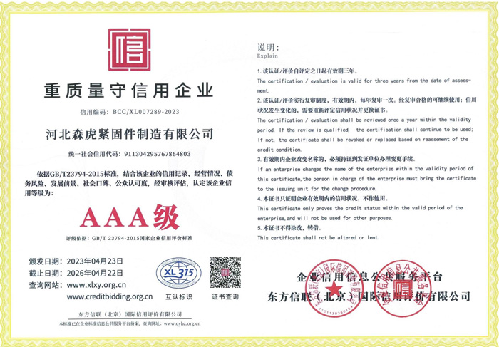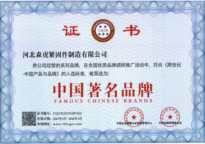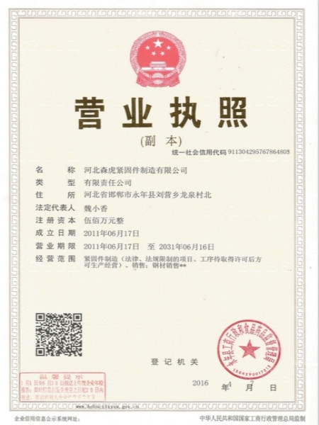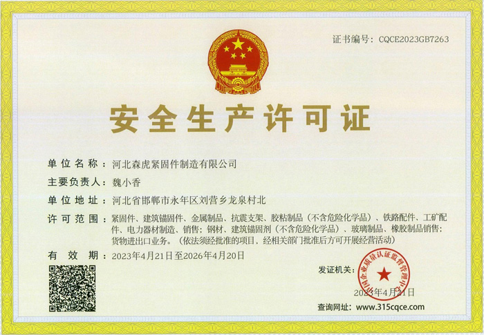 河北森虎緊固件制造有限公司成立于2011年,是建廠較早的緊固件企業(yè)。西臨京廣線,東臨京深高速,地理位置優(yōu)越,交通便利。 主要生產(chǎn):化學(xué)錨栓、機(jī)械錨栓、定型化學(xué)錨栓、高強(qiáng)度8.8級(jí)化學(xué)錨栓、自切底機(jī)械錨栓、車修壁虎,膨脹螺栓,植筋膠。 質(zhì)量方針:先進(jìn)技術(shù)、科學(xué)管理、優(yōu)良品質(zhì)、用戶滿意; ...資質(zhì)榮譽(yù)